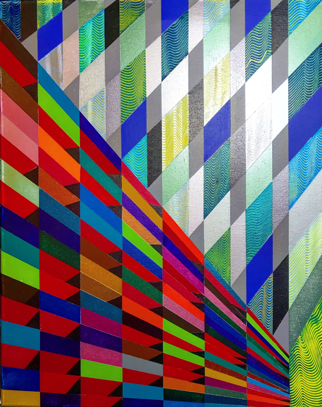 My work creates unexpected moments of precariousness. I use metallic, iridescent, and fluorescent acrylics, textures that lift the paint from the canvas, and a variety of hot glues which add dimensionality to the surfaces. The goal is creating what I call deep patterns, which elicit a Jungian sense of collective knowledges and connections. I seek a reckoning with the artwork as a presence unto itself, and the use of these more “exotic” mediums in concert with natural and UV lights and self-created soundscapes produces a moment of active tension both in person and via digital reproduction. I create work which collapses clear distinctions via aufhebung, the negation of negation: both paint and sculpture, both presence and absence, both expectation and result. Movements out of flat planes create multivalent pieces: sculptural mixed media using canvas or wood as a base for horizontal presentations, painterly mixed media intended to be hung from vertical surfaces, and modular work on multiple substrates which can combine infinitely through the structural use of magnets. The goal is the substantiation of imagination: fooling the eye into seeing things it never imagined could exist, and then going beyond to ask for willing participation in a different way of seeing the world around us, externally and internally.